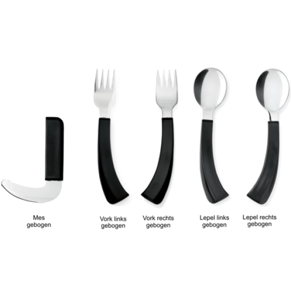 • Bestekset gebogen Rechts: gebogen lepel, gebogen vork, gebogen mes