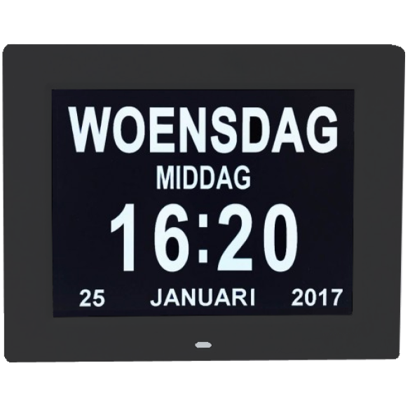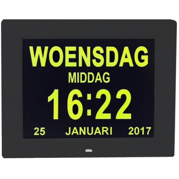 Behalve de tijd geeft de digitale dementieklok ook de datum, dag en het dagdeel weer. Hierdoor heeft de gebruiker direct een overzicht van de voor hen belangrijkste gegevens en wordt zij door het kijken naar de klok herinnert aan het juiste dagdeel en de tijd.