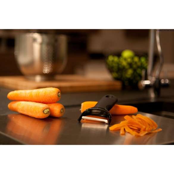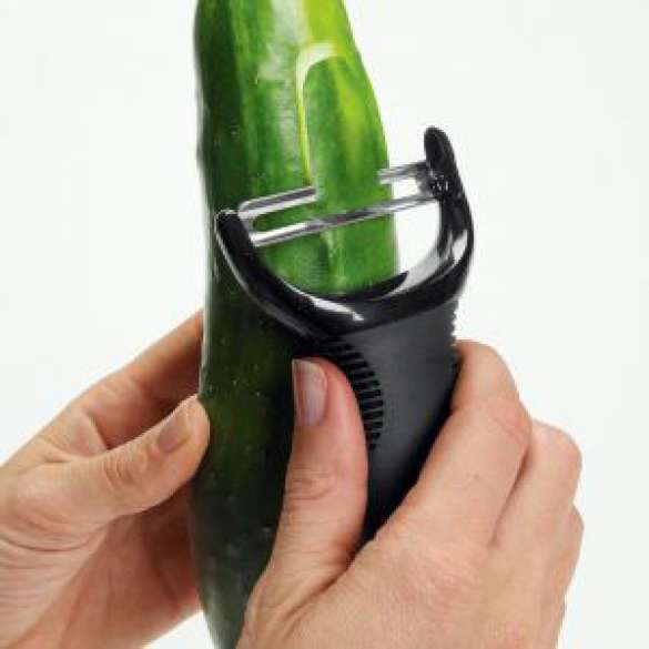 De Good Grips dunschiller heeft een draaibaar mes zodat er weinig beweging van de pols of elleboog is vereist.