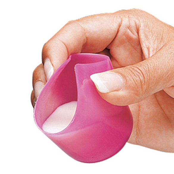 De flexibele medicijnbeker wordt geleverd in twee uitvoeringen. Een roze uitvoering met een inhoud van 30 milliliter en een blauwe uitvoering met een inhoud van 59 milliliter.