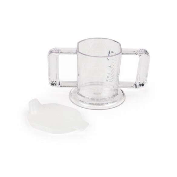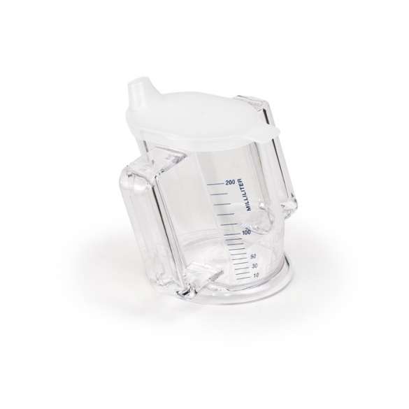 De beker is transparant, zodat de hoeveelheid vloeistof te zien is en wordt geleverd met deksel. De hoeveelhuid vocht kan gereguleerd worden door aan het mondstuk te zuigen.