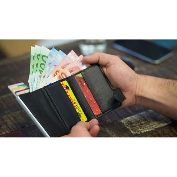 De Card Guard is gemaakt van stijlvol vinyl leer. De Card Guard is niet alleen geschikt voor het opbergen van pasjes, maar beschikt ook over een uitklapbaar vak voor papiergeld en nog eens drie extra pasjes.