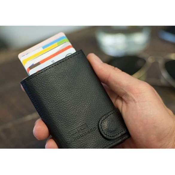 De Card Guard protector is een chique zwarte uitschuifbare pasjesportemonnee.
