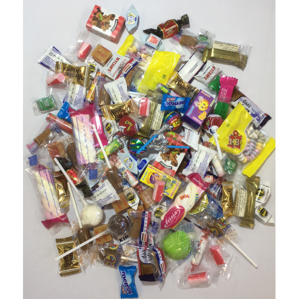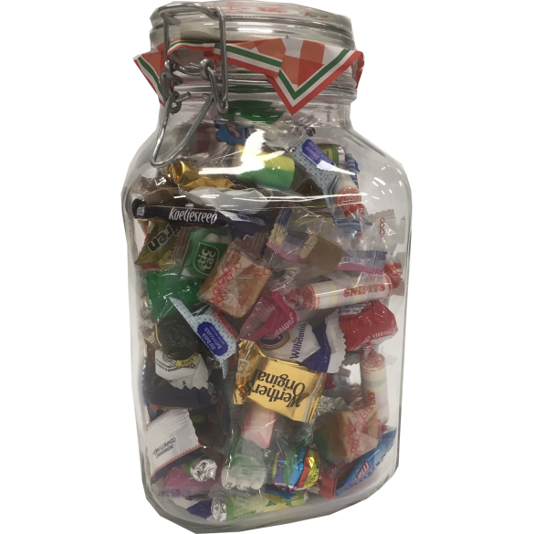 Deze grote snoeppot met 3 liter inhoud bevat meer dan 100 snoepjes en is gevuld met: